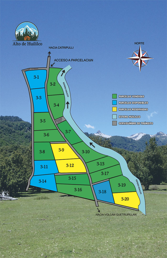 Alto de Huililco se compone de 20 exclusivas parcelas de 5.000 m2 útiles, en un terreno plano con agua y factibilidad de conexión eléctrica. El Estero Huililco es el límite natural por el lado oeste de la parcelación y tiene un sendero que permite excursiones al volcán Quetrupillan y sus alrededores.